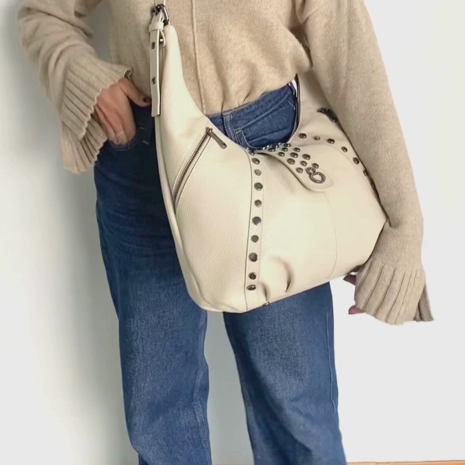 - Esterno in pelle martellata e dettagli accessori borchie