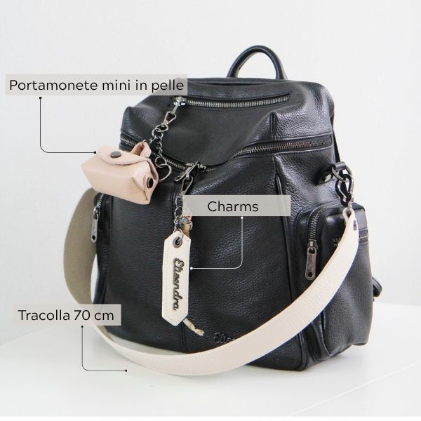 Grazie ai suoi moschettoni integrati, puoi aggiungere tracolle intercambiabili (60 o 70 cm), portamonete mini in pelle e charms Elisendra, trasformando ogni utilizzo in un'esperienza unica.